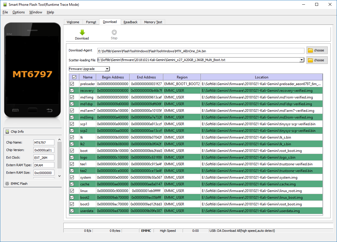 - Scatter-loading file should be set to the specific scatter file of the firmware that was customized for the Kali-Gem built, which is located in the firmware folder