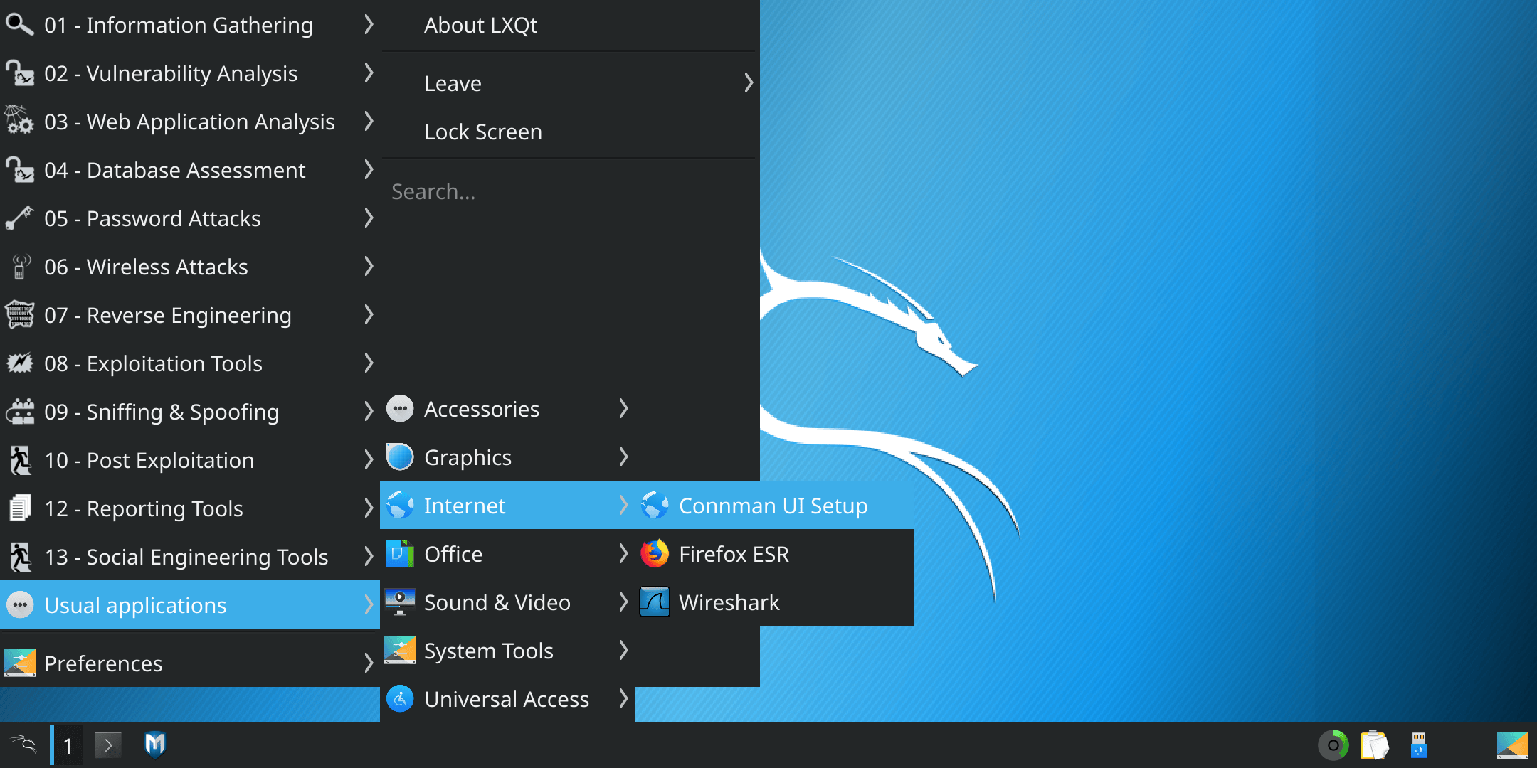 bluetoothctlon the command line to setup a mouse - This image comes with the kali-tools-top10 metapackage pre-installed by default. If you wish to install extra tools please refer to our metapackages page or by running: