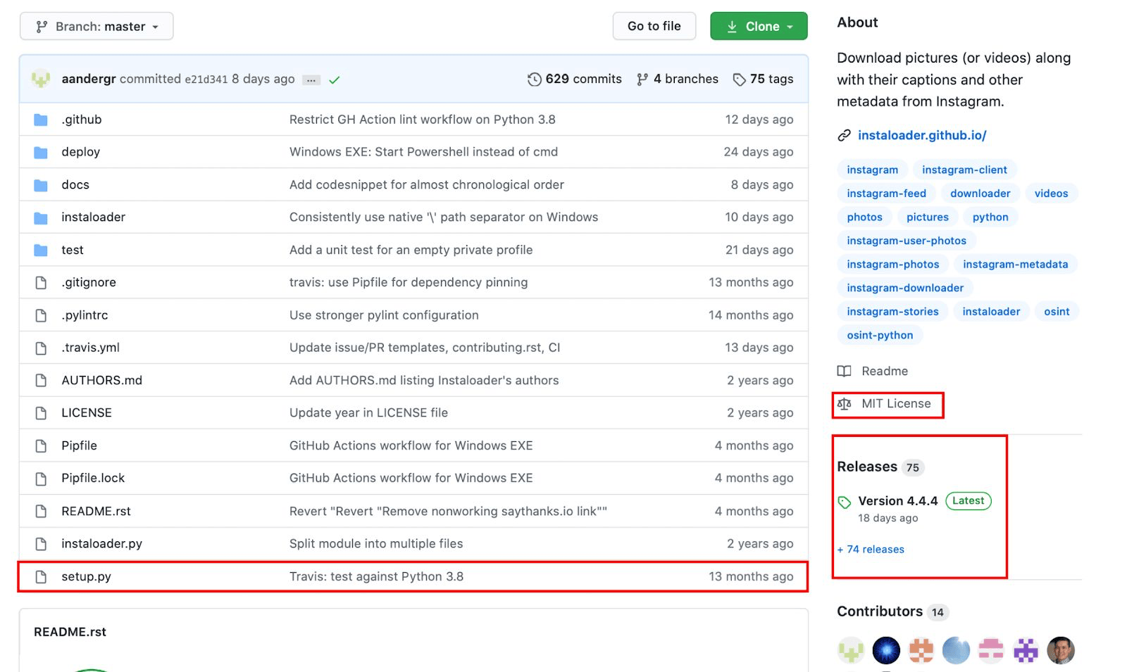 Going to the GitHub’s release page, we can see the latest version (which at the time of writing is 4.4.4). Here is the option to download instaloader-v4.4.4-windows-standalone.zip, as well as Source Code (zip), and Source Code (tar.gz). We are interested in the tar.gz option.