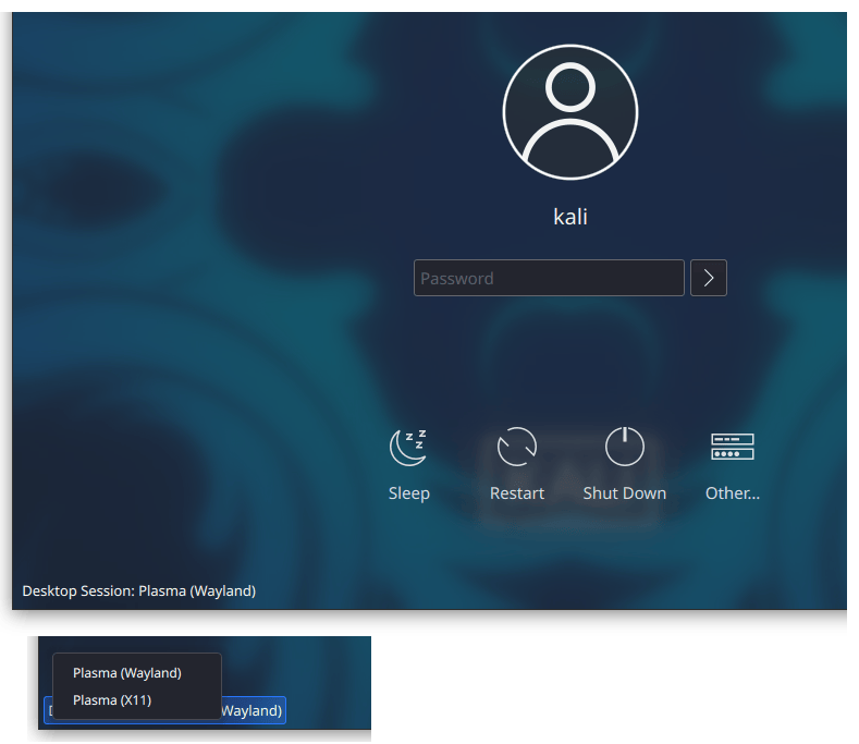 Since Kali Linux 2023.1, Wayland is the default display server for the KDE desktop.
