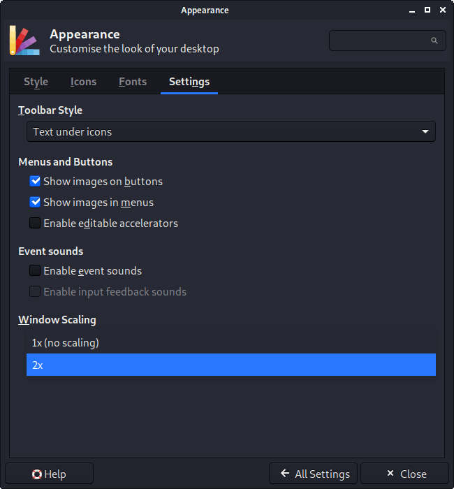 This mode is able to scale every window to a 2x factor, but in some cases, this ratio is too big for some displays. In this situation, you can enable the HiDPI mode and later configure a custom fractional scaling inside the Xfce’s display settings. A recommended configuration would be 1.3x-1.5x