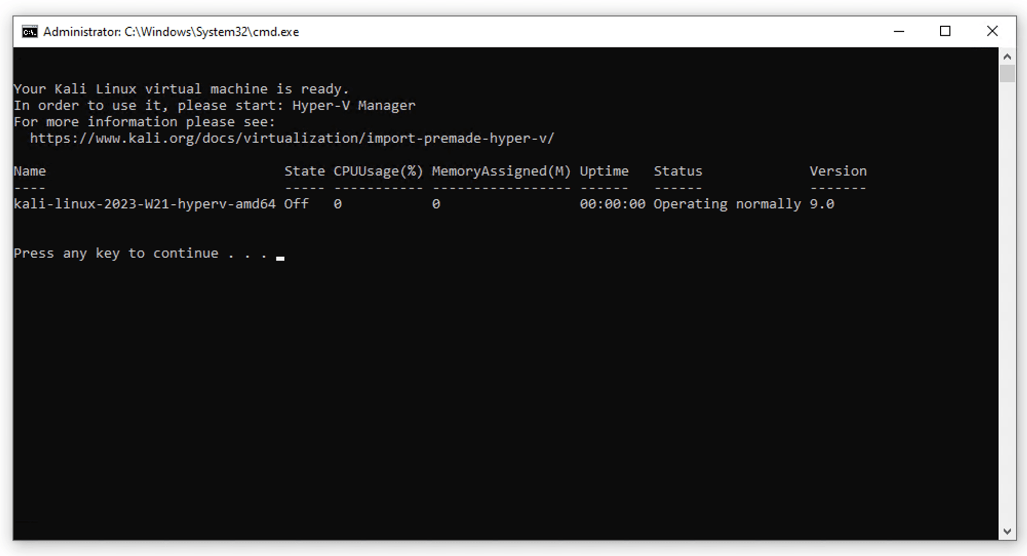 After approving the popup, a console appears, and the script run a series of steps in order to setup the Kali Linux Virtual Machine. If all goes well, we should see the following screen: