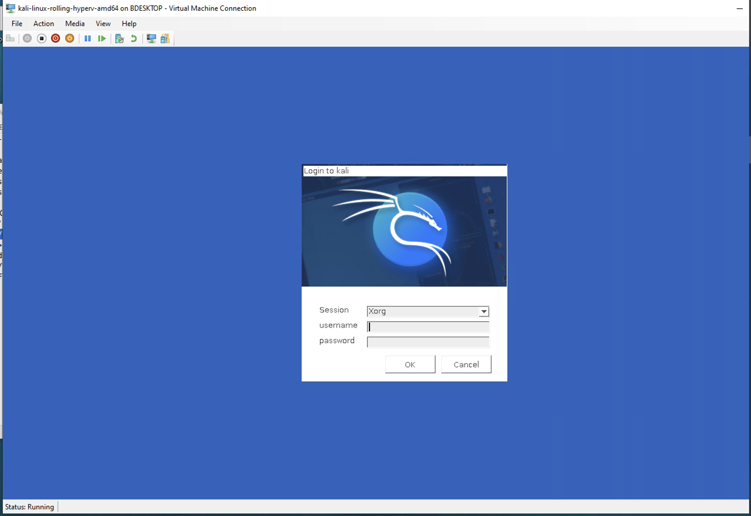 We then launch the Hyper-V Manager, right-click on the Kali VM, click Start, then right-click again and click Connect. We should see the usual Kali login screen, or rather, just have a glimpse of it, before a popup window appear in the foreground: