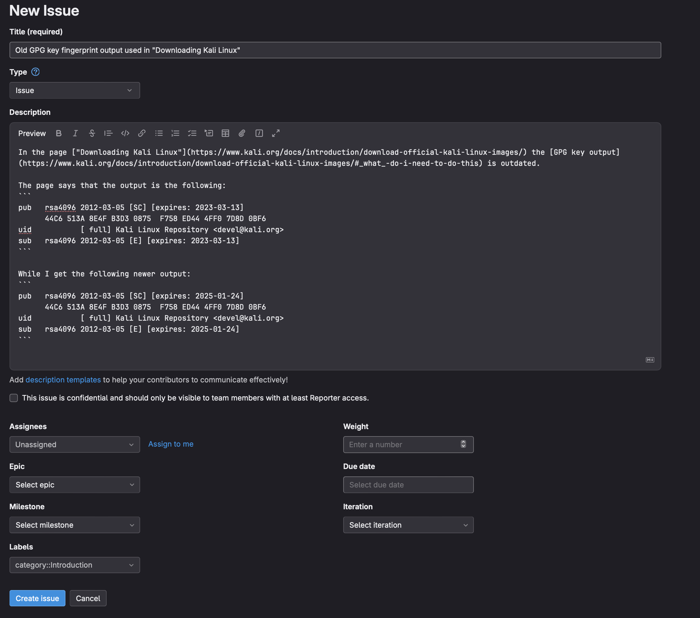 GitLab is where all of our packages, docs pages, tool pages, build scripts, and more live. Everything is open source and contributions are encouraged. If something is inefficient, there is a typo somewhere, or you want to see a new feature added to Kali this is the place to go. If you know exactly what you want to change, please create a merge request doing so. If you don’t know, you can create an issue describing the issue or feature that you want changed.