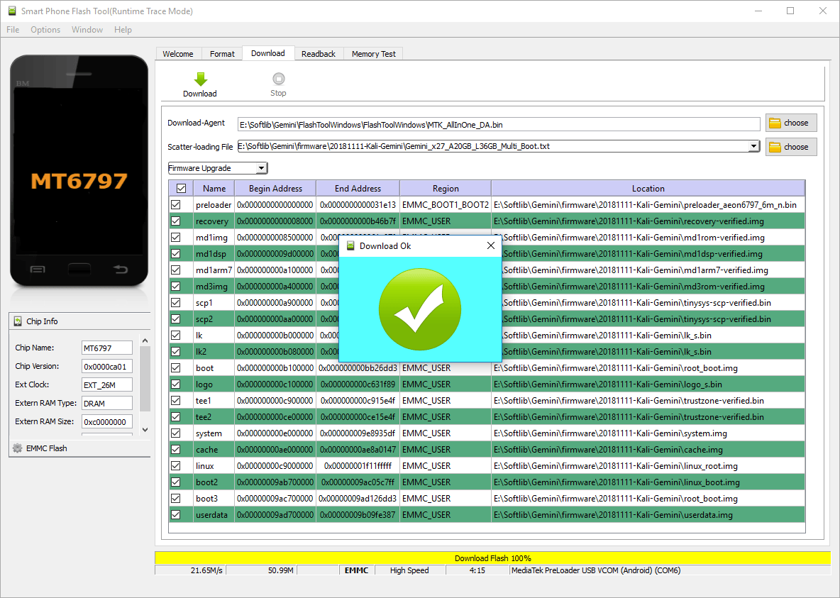 Operating systems aren’t installed but flashed using the Smart Phone Flash tool provided by Mediatek. To flash a new Gemini PDA with rooted Android and Kali Linux requires only four steps: