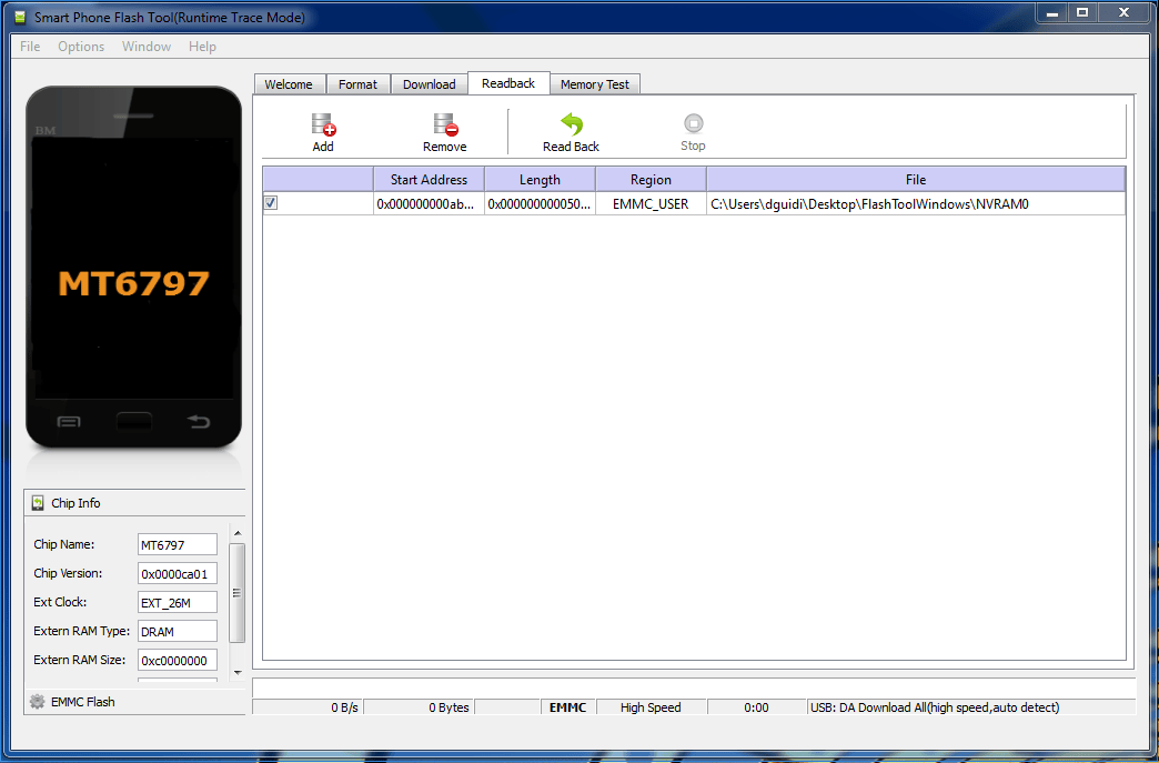 To back up the NVRAM partition, click the Read Back button, connect your Gemini to your PC, and power on the Gemini by pressing the Esc button for about a second or two. The flash tool will detect the unit and back up the partition.