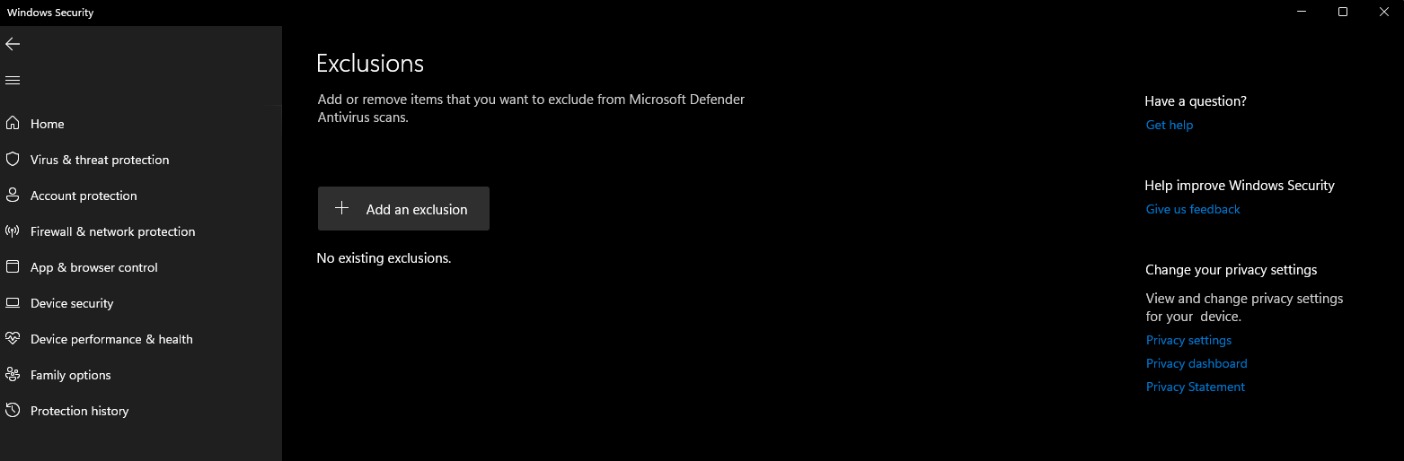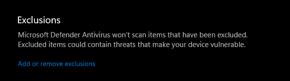 - Under “Virus & threat protection settings”, select “Manage settings”, and then under “Exclusions”, select “Add or remove exclusions”.
