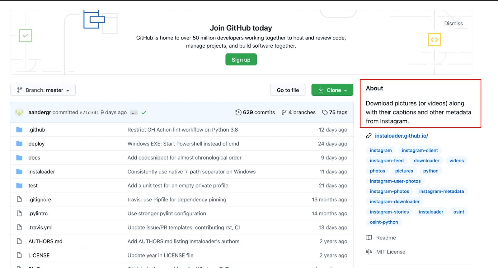 kali@kali:~/kali/packages/instaloader$ git log