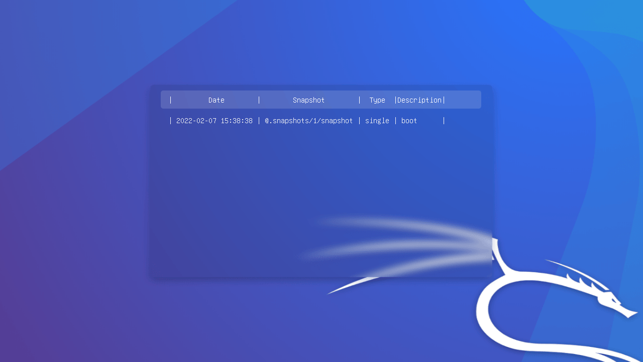 Out of the box Kali creates snapshots of the root directory to allow system rollbacks. Snapshots are automatically created during apt operations, at specified time intervals, and on every boot. The configuration can be changed via the “snapper-gui” tool. Just click on the little icon in the top left hand corner and select “Properties”: