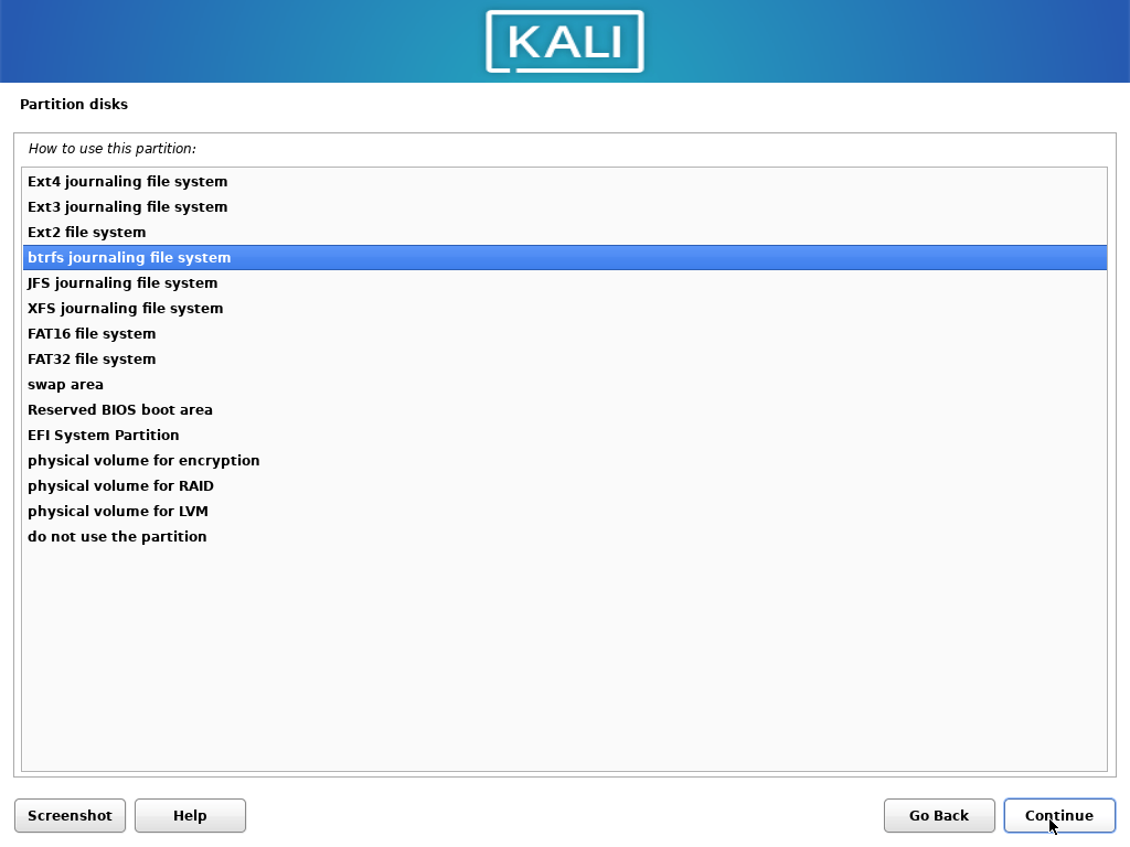 - The installation steps are identical to a default Kali installation except changing “ext4” to “btrfs” as file system: