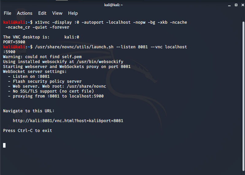 kali@kali:~$ /usr/share/novnc/utils/novnc_proxy --listen 8081 --vnc localhost:5900