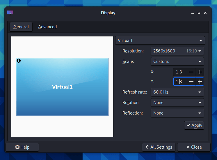 This mode is able to scale every window to a 2x factor, but in some cases, this ratio is too big for some displays. In this situation, you can enable the HiDPI mode and later configure a custom fractional scaling inside the Xfce’s display settings. A recommended configuration would be 1.3x-1.5x
