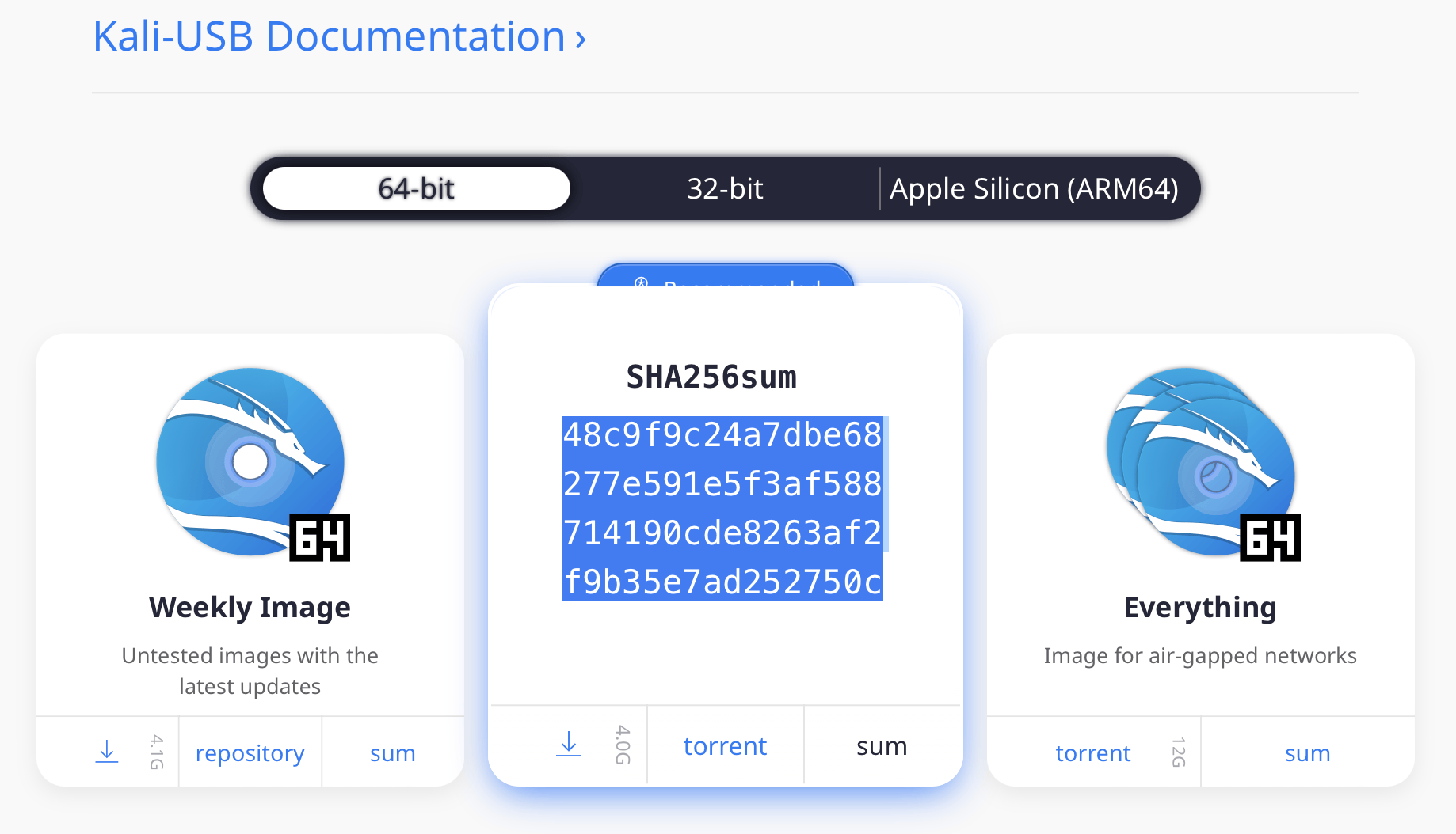 If you downloaded your copy of the Kali Linux ISO image via the torrents, in addition to the ISO file (e.g. kali-linux-2024.1-live-amd64.iso), there will be a second file containing the computed SHA256 signature for the ISO, with the extension “.txt.sha256sum” (e.g. kali-linux-2024.1-live-amd64.txt.sha256sum).