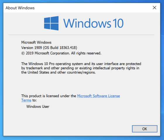 We can check our build version by pressing WIN+R and then typing in winver. We will be shown a pop-up like this: