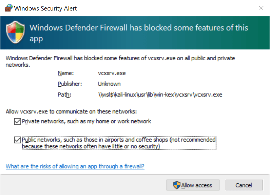 When starting Win-KeX SL for the first time, ensure to select Public networks when asked for authorisation to allow traffic through the Windows Defender firewall