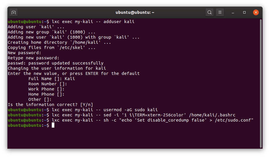 4 - Create non-root user - “kali” in this example:kali@kali:~$ lxc exec my-kali -- adduser kali