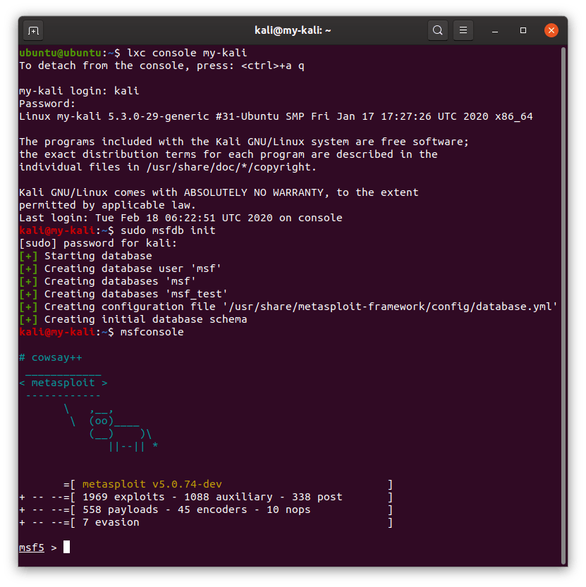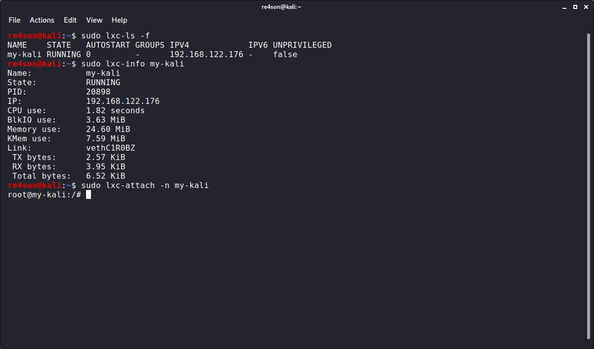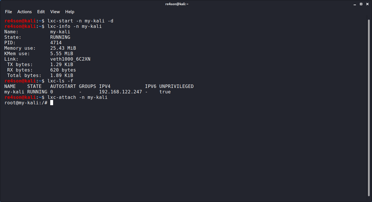 4 - Attach to the container viakali@kali:~$ sudo lxc-attach -n my-kali