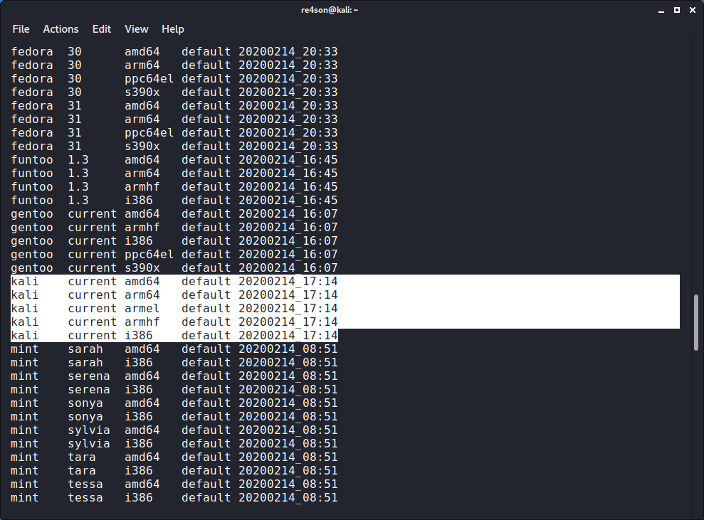 Kali images are available on the image server for LXC and LXD and can easily be launched either in LXD using the “images:” image server or in LXC using the “lxc-download” template.