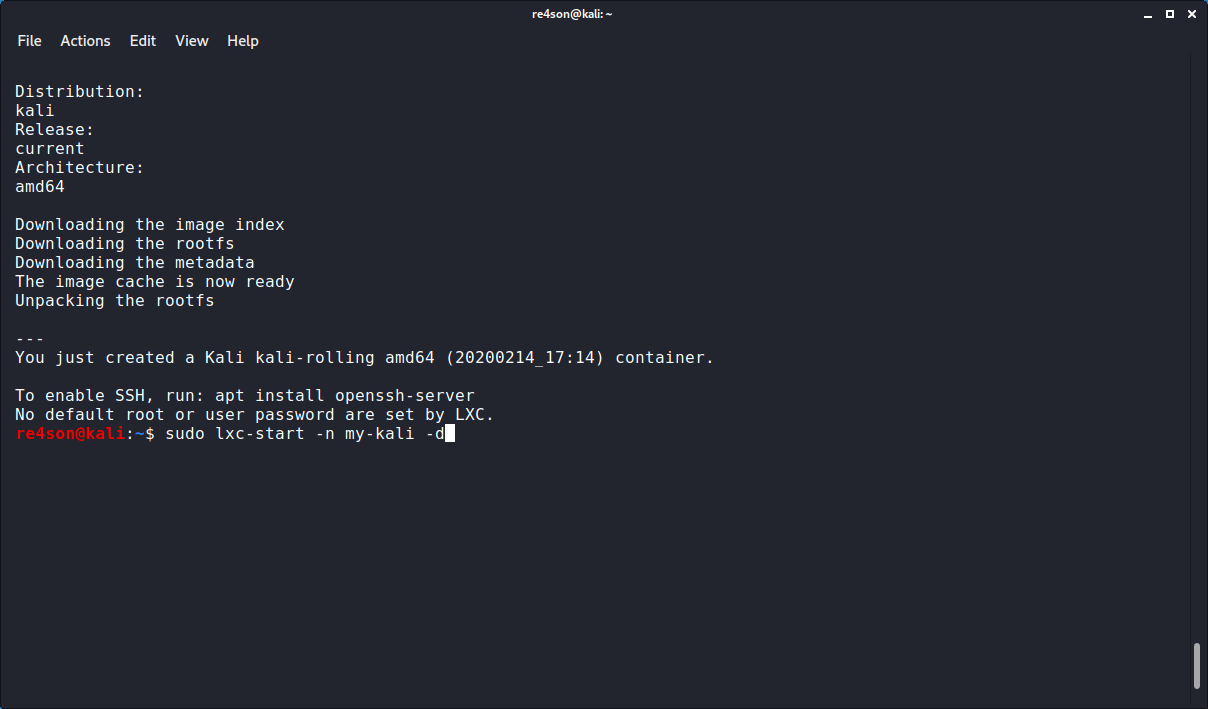 kali@kali:~$ sudo lxc-start -n my-kali -d