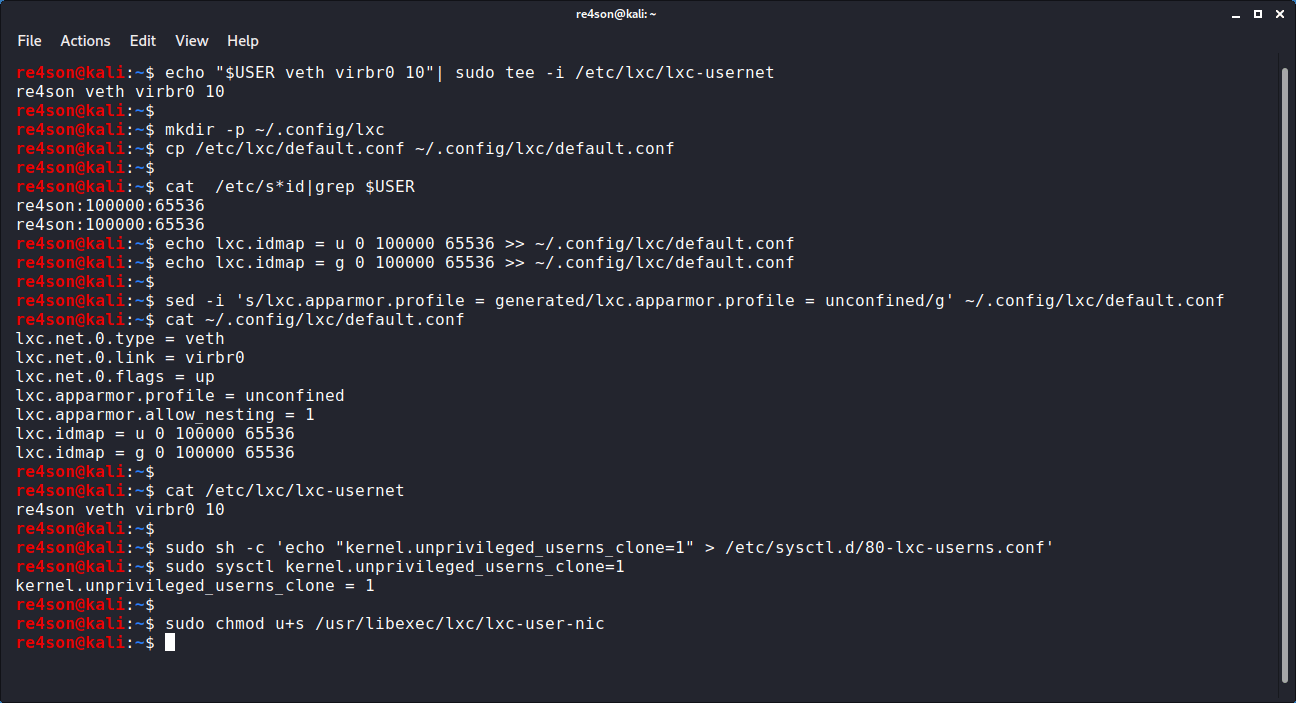 kali@kali:~$ echo lxc.idmap = u 0 100000 65536 >> ~/.config/lxc/default.conf