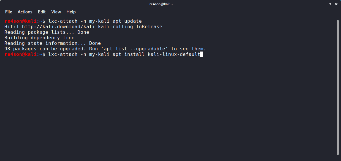kali@kali:~$ lxc-attach -n my-kali apt install -y kali-linux-default