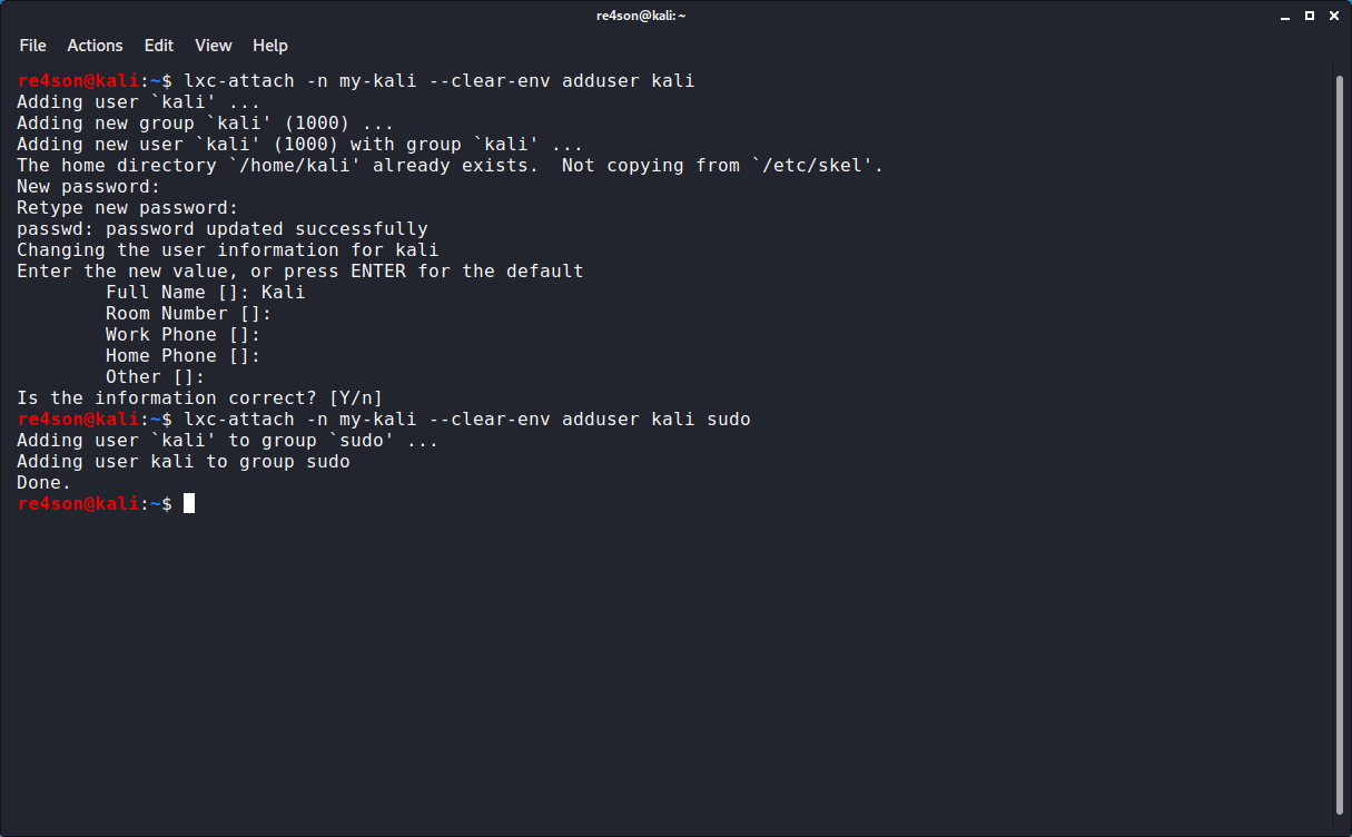 kali@kali:~$ lxc-attach -n my-kali --clear-env adduser <username> sudo