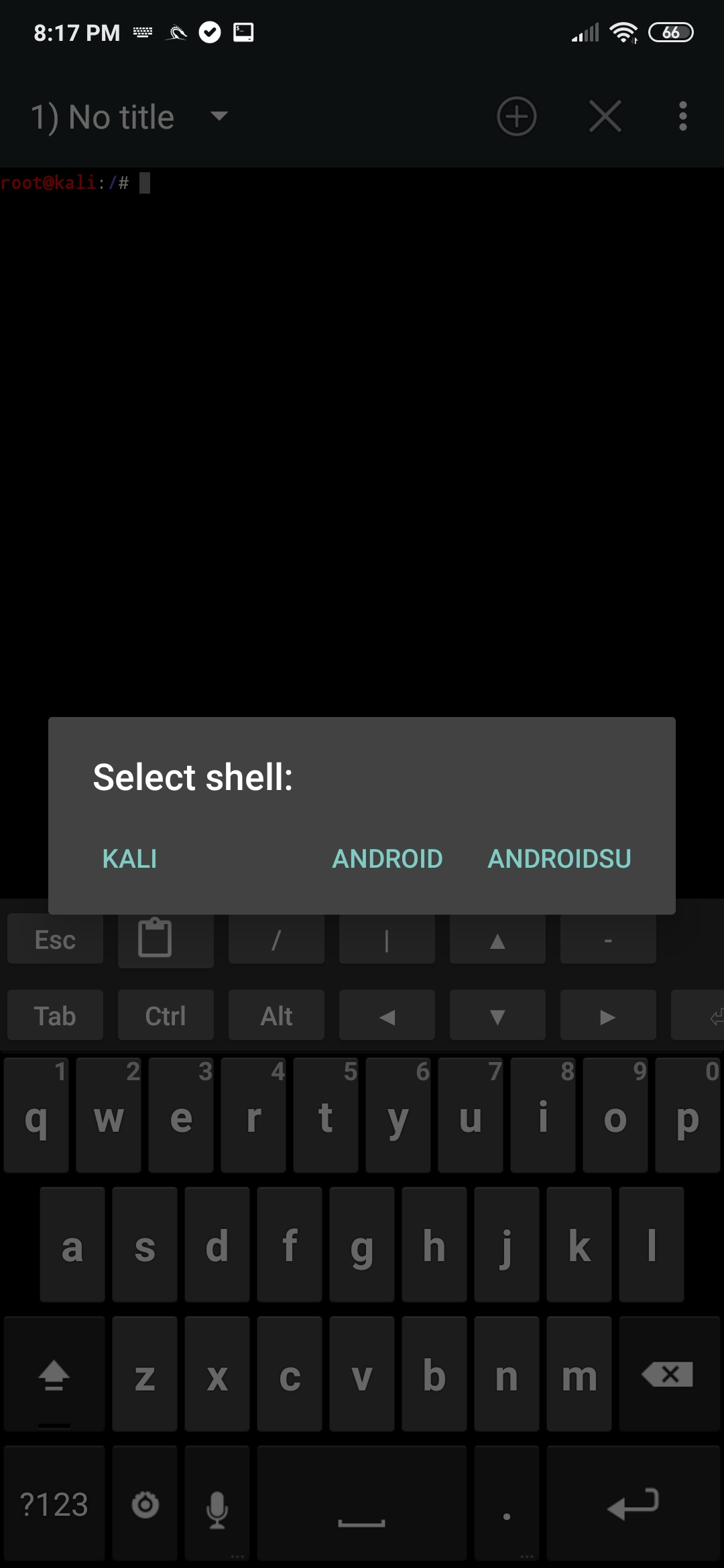 This application allows you to open up one of several kinds of terminals - a chrooted Kali terminal, a standard Android terminal, and a root Android terminal.