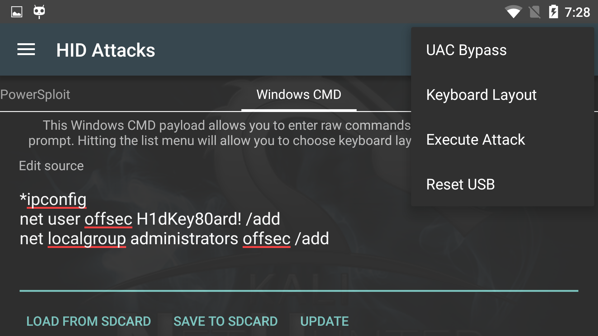 The NetHunter HID Attacks turn your device and its OTG USB cable into a pre-programmed keyboard, able to type any given commands. Previously, only “Teensy” type devices were able to do this… but no longer! This attack generally works very well. However, if it becomes non-responsive, simply select Reset USB from the menu to freshen up the USB stack.