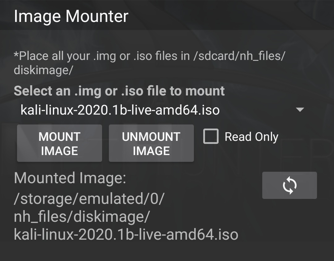 If mass storage gadget mode has been enabled then .iso and .img files can be mounted in the Image Mounter menu, before connecting the device to the USB port of a computer which will then treat NetHunter as a USB drive on which the image was installed: