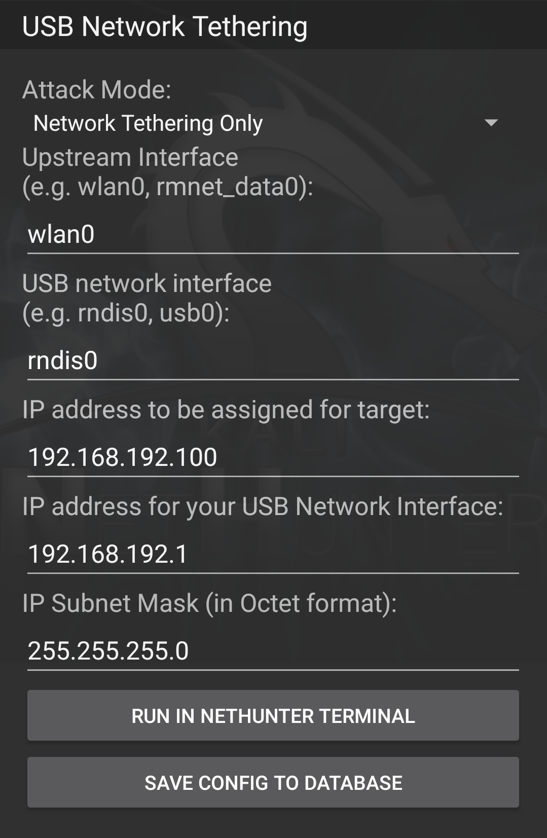 If RNDIS gadget mode is enabled then the USB Network Tethering menu can be used for various network interface based attacks: