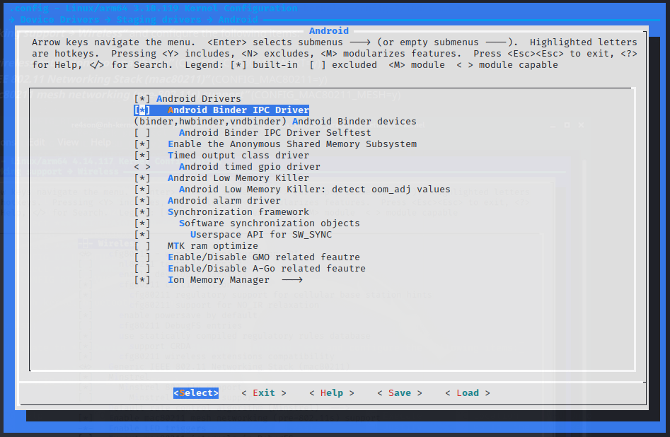 - select “Android Binder IPC Driver” (CONFIG_ANDROID_BINDER_IPC=y)