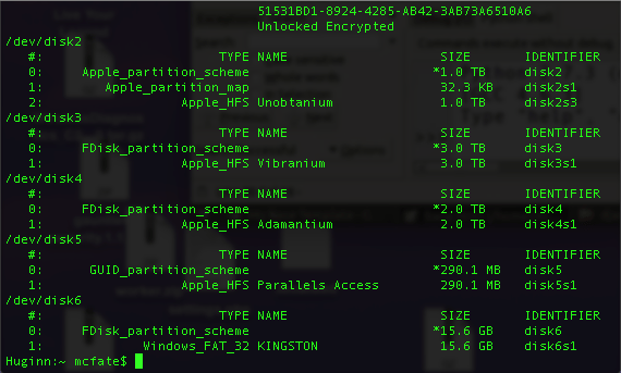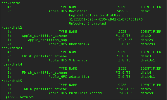 diskutil listat the command prompt.You will get a list of the device paths (looking like /dev/disk0, /dev/disk1, etc.) of the disks mounted on your system, along with information on the partitions on each of the disks.
