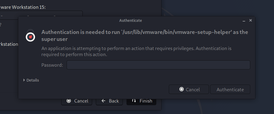 If vmware wasn’t called with superuser privileges, you may be prompted for a password.