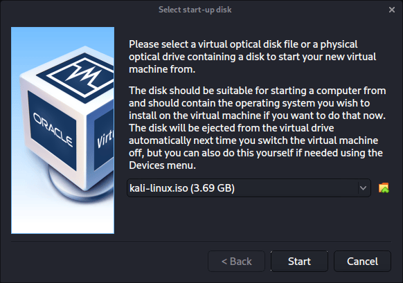 The first time we run it, we will get a prompt saying do we wish to mount an image to use as a “start-up disk”. We want to use our Kali image, rather than a physical drive, so we select the icon to the side of the drop down.
