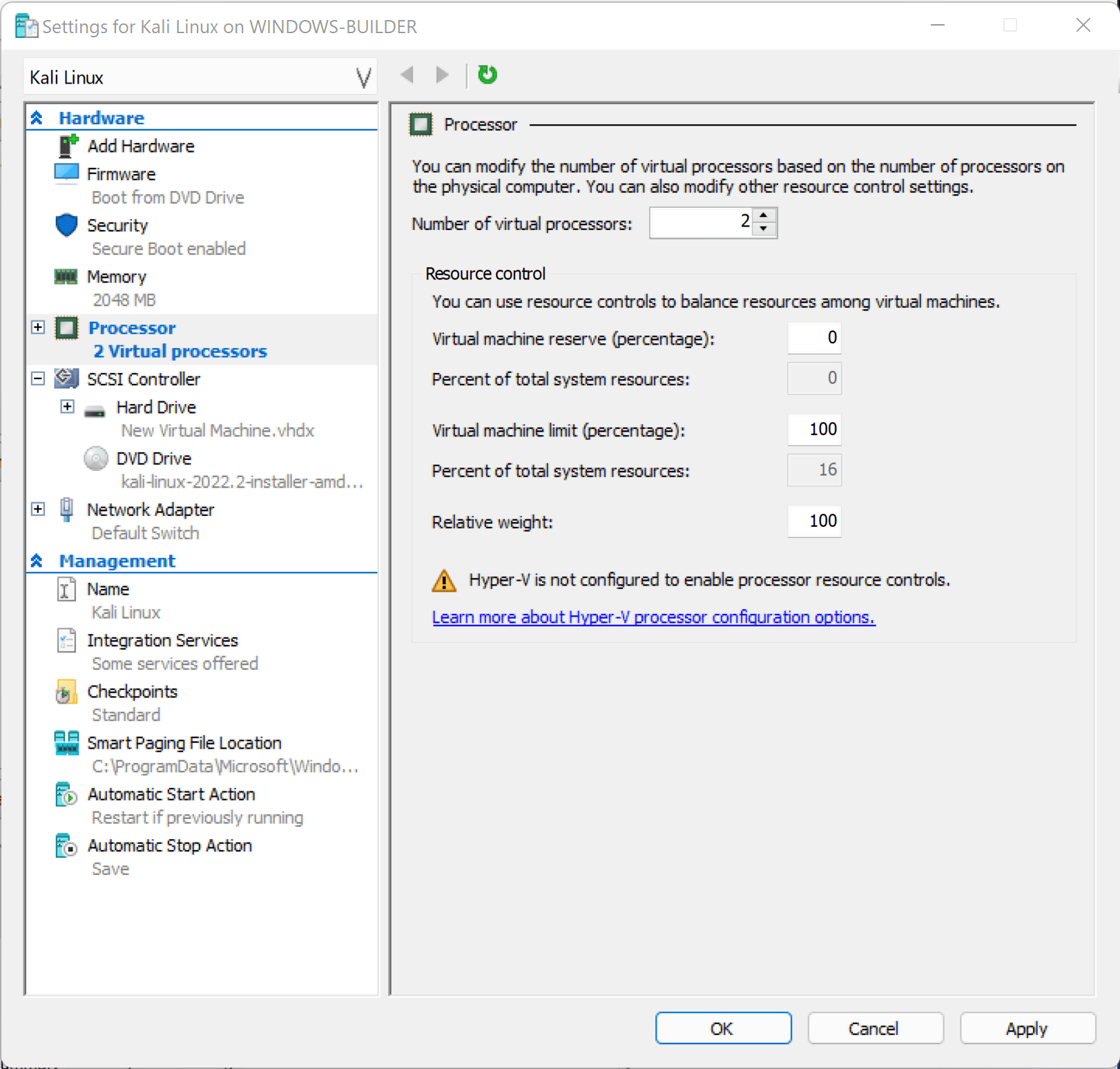 In the case of this machine, the only change needed was for the number of virtual processors. We dropped it down from 6 to 2. We are then ready to connect to our VM and continue setup like normal