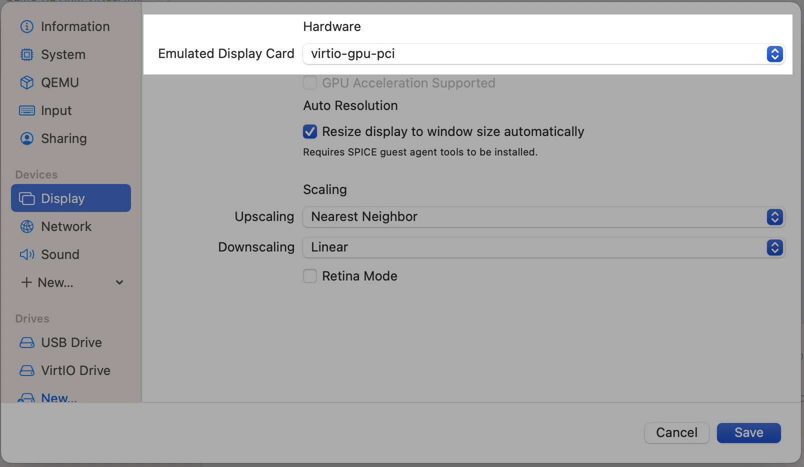 We should also update the Display Card emulation. Select the virtio-gpu-pci