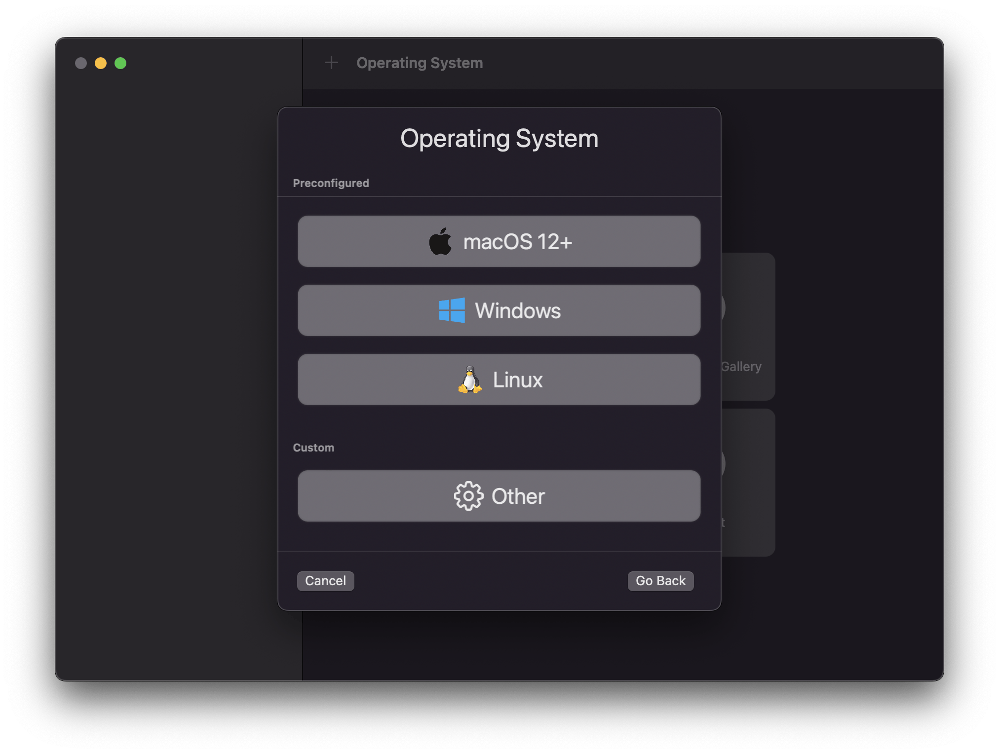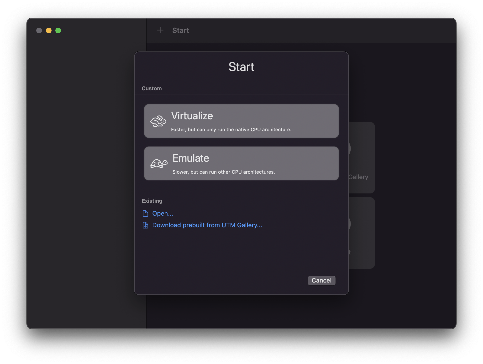To install and set up a UTM VM it is pretty straightforward. We first download UTM and then launch the app. After this we can click create VM and start the short process: