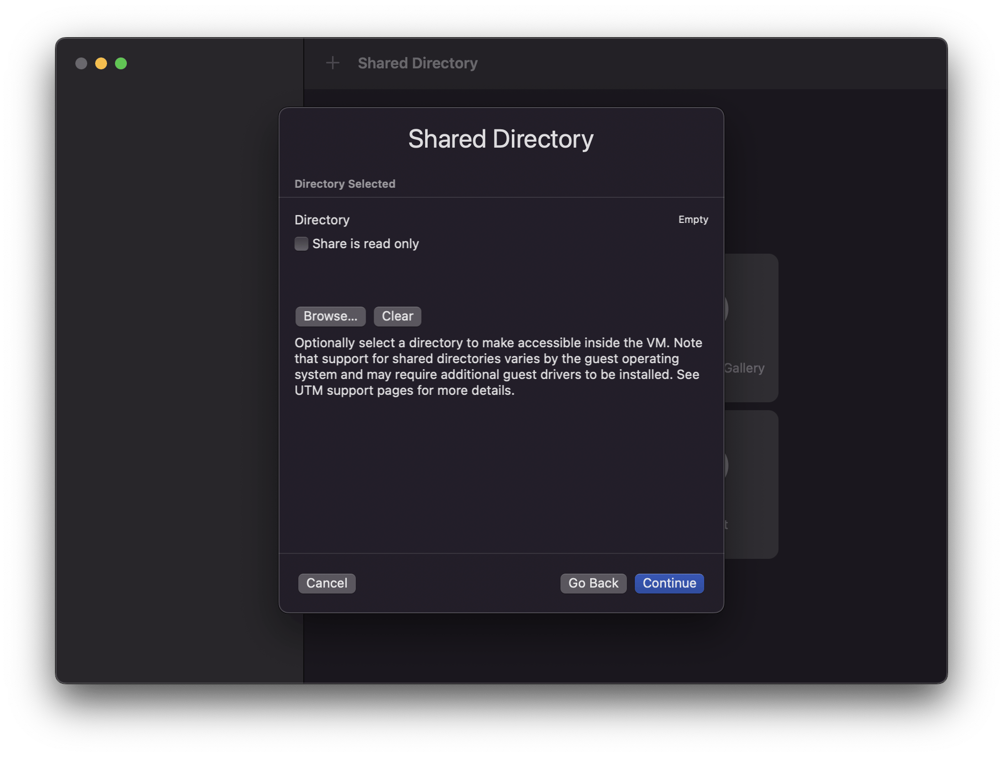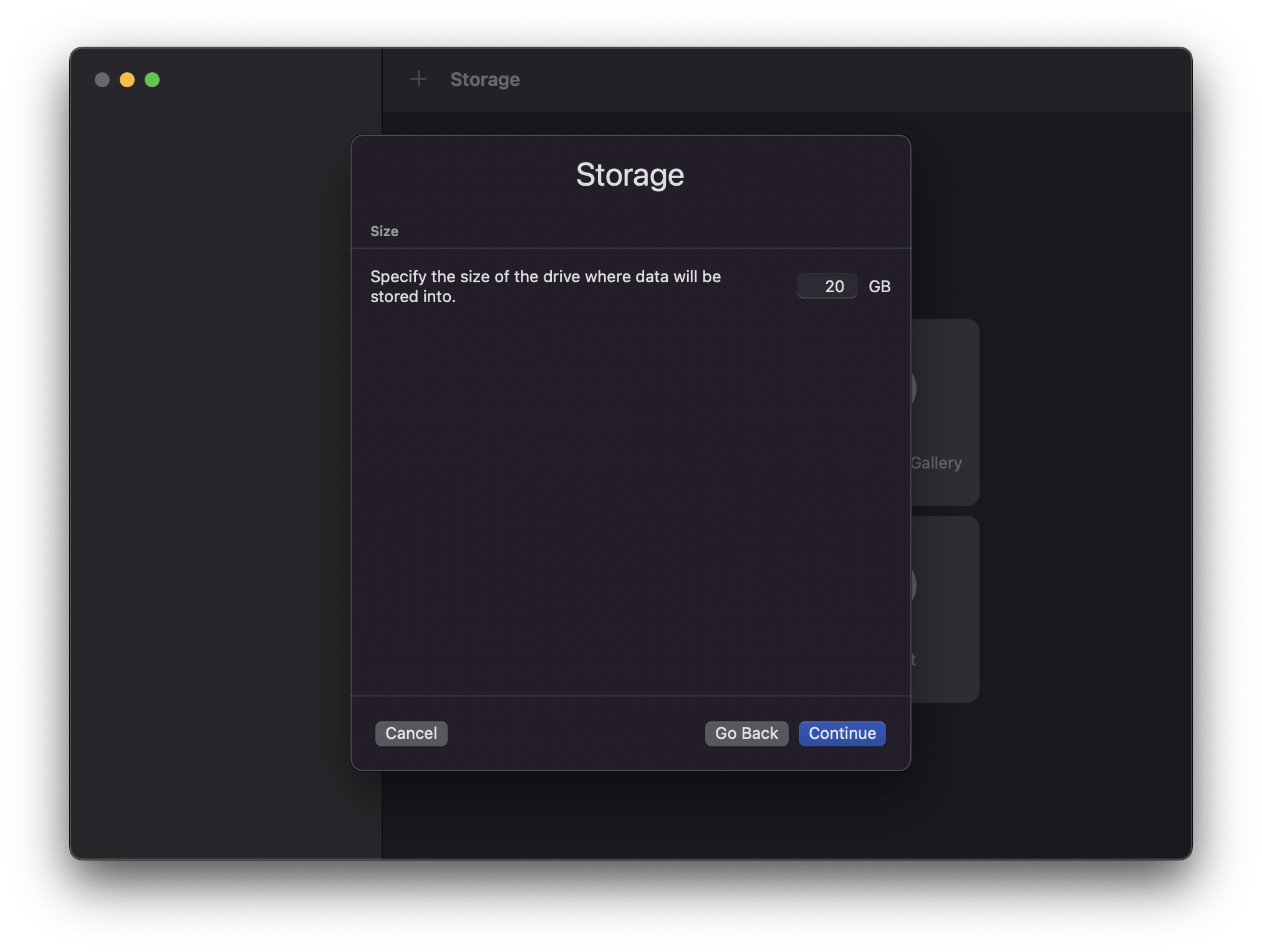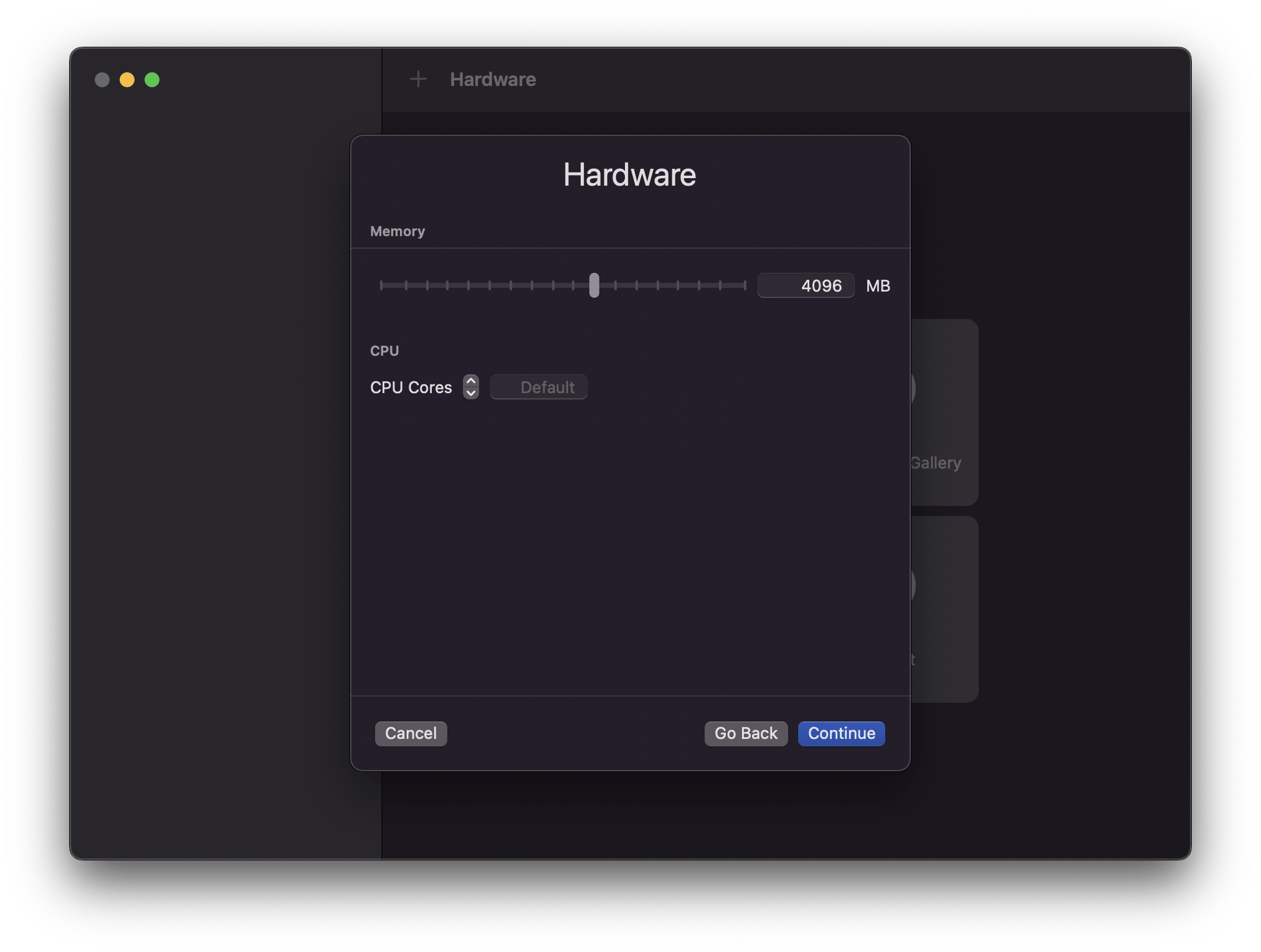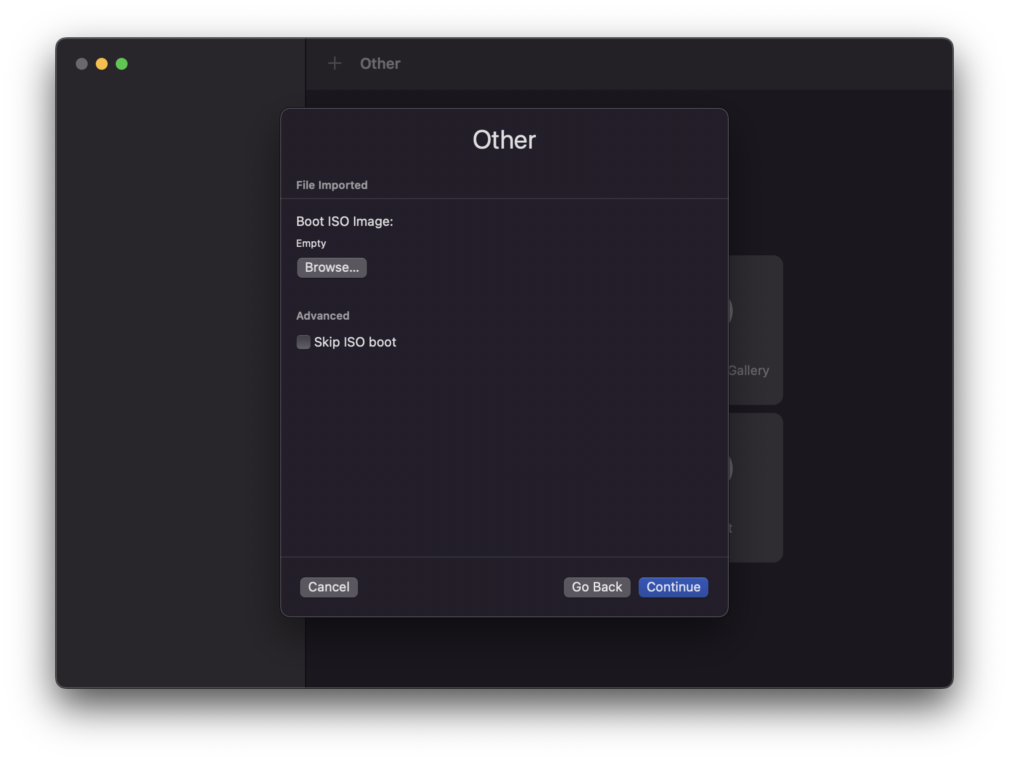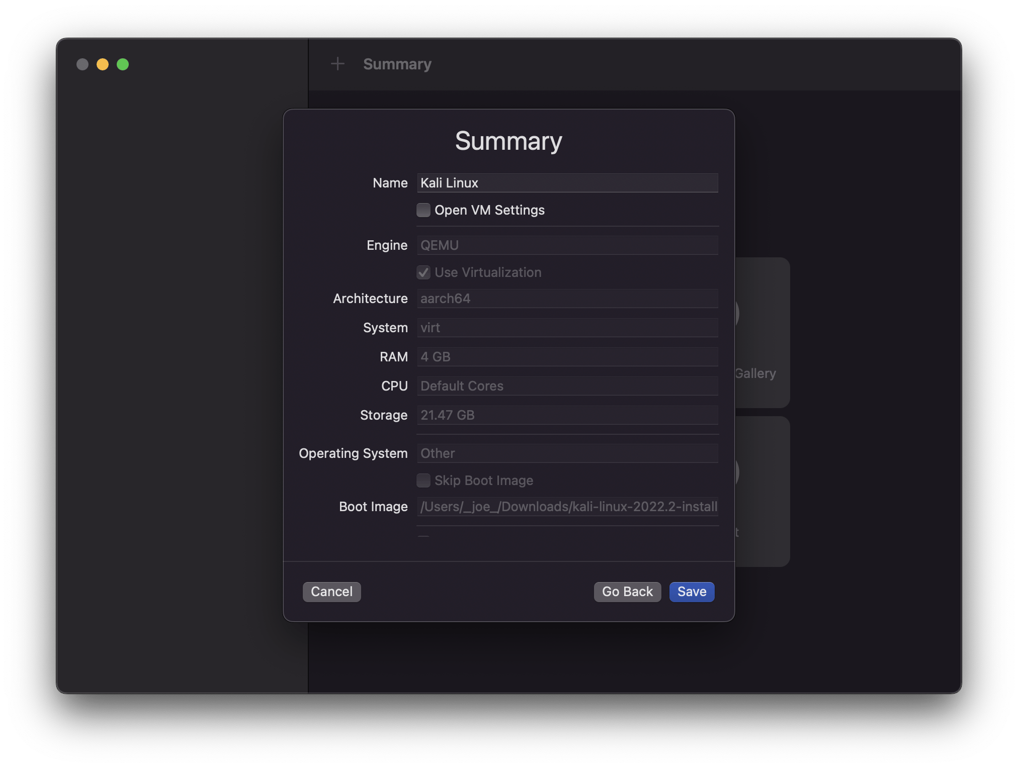 We will select Virtualize, as we will be using a Kali Apple M1 installer iso which will bring us to the next page: