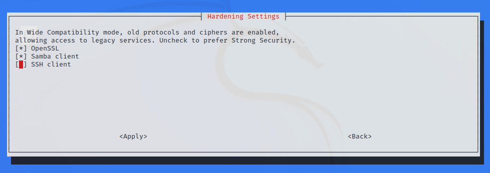 Please note, unlike OpenSSL and Samba, this weakened behaviour is NOT enabled by default, as SSH is a sensitive enough component that we prefer to keep it Secure by default. Therefore if you are interested in this setting, you will have to run kali-tweaks, enter the Hardening section and enable it in there.