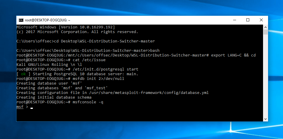 While this setup of Kali on Windows is not optimal due to various environmental restrictions (such as the lack of raw sockets and lack of customised Kali kernel), there are still many situations where having Kali Linux alongside your Windows 10 machine can be beneficial. One example that comes to mind is consolidation of workspaces, especially if Windows is your main working environment. Other useful situations that crossed our minds were standardizing tools and scripts to run across multiple environments, quick porting of Linux penetration testing command line tools to Windows, etc. For example, below is a screenshot of running the Metasploit Framework from Kali Linux, over WSL.