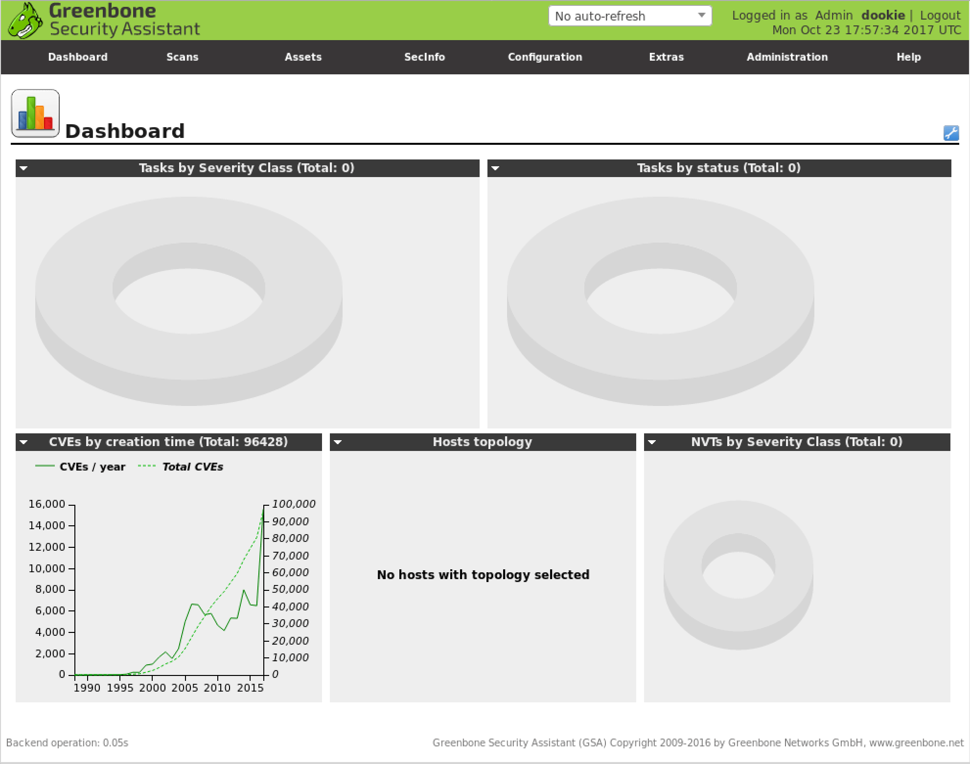 The Greenbone Security Assistant is the OpenVAS web interface, available on your local machine (after starting OpenVAS) at https://localhost:9392. After accepting the self-signed certificate, you will be presented with the login page and once authenticated, you will see the main dashboard.
