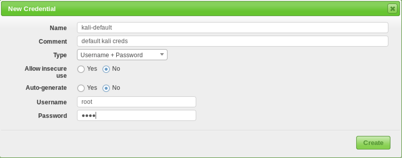 Vulnerability scanners provide the most complete results when you are able to provide the scanning engine with credentials to use on scanned systems. OpenVAS will use these credentials to log in to the scanned system and perform detailed enumeration of installed software, patches, etc. You can add credentials via the “Credentials” entry under the “Configuration” menu.