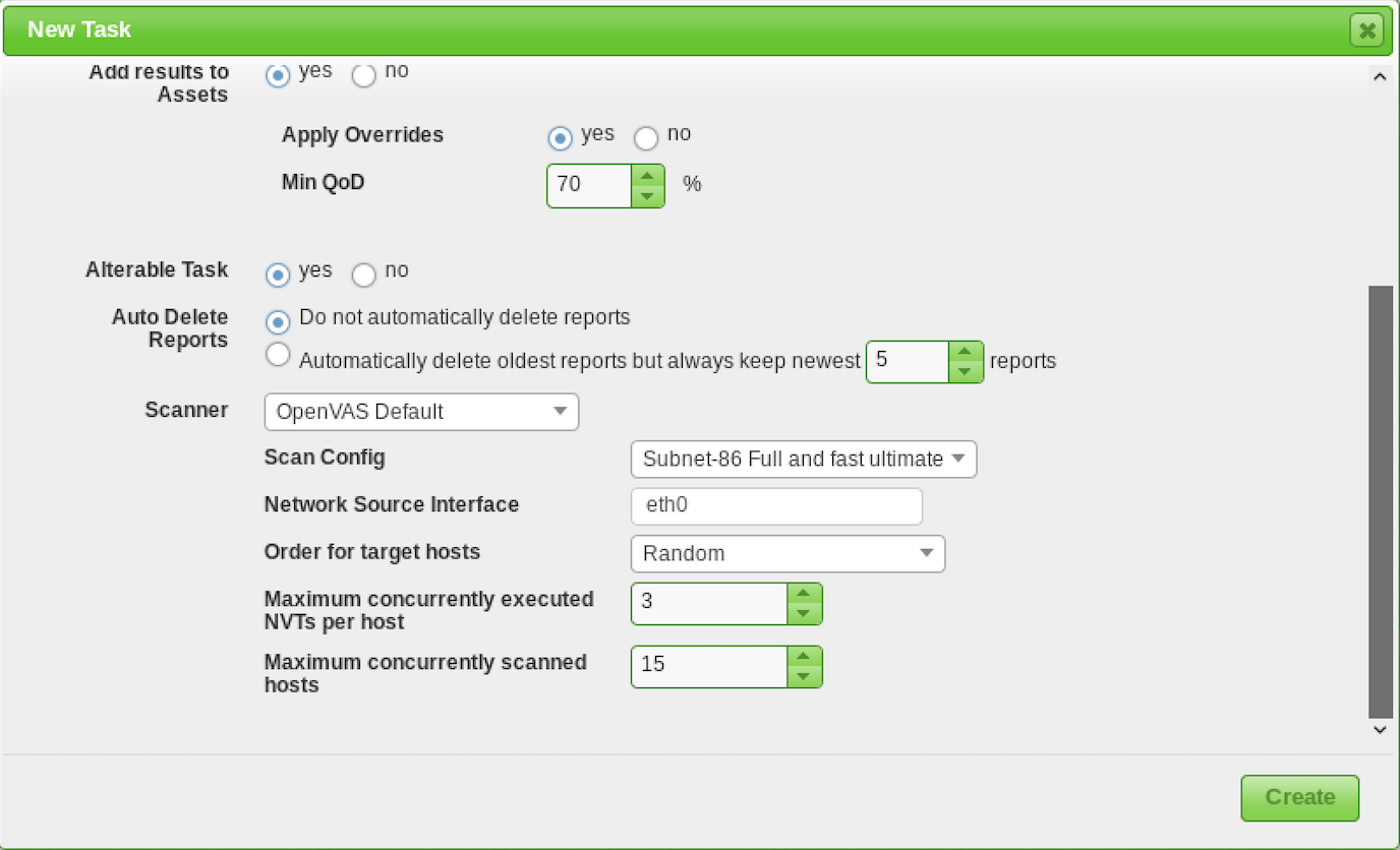 Your credentials, targets, and scan configurations are setup so now you’re ready to put everything together and run a vulnerability scan. In OpenVAS, vulnerability scans are conducted as “Tasks”. When you set up a new task, you can further optimize the scan by either increasing or decreasing the concurrent activities that take place. With our system with 3GB of RAM, we adjusted our task settings as shown below.