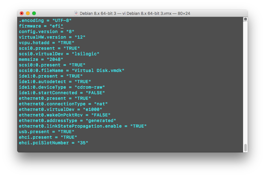 Be careful with copy and paste. If you paste this line into the editor, you may get funny “Mac quotes” and this will break the VM. Your .vmx file should look something like this: