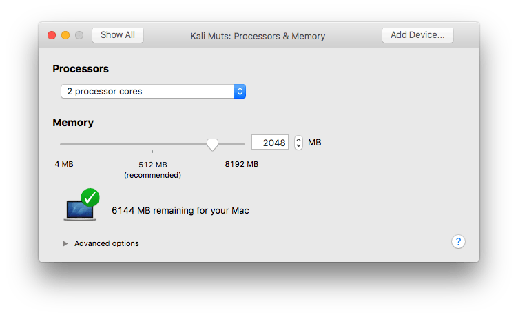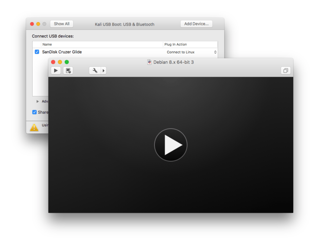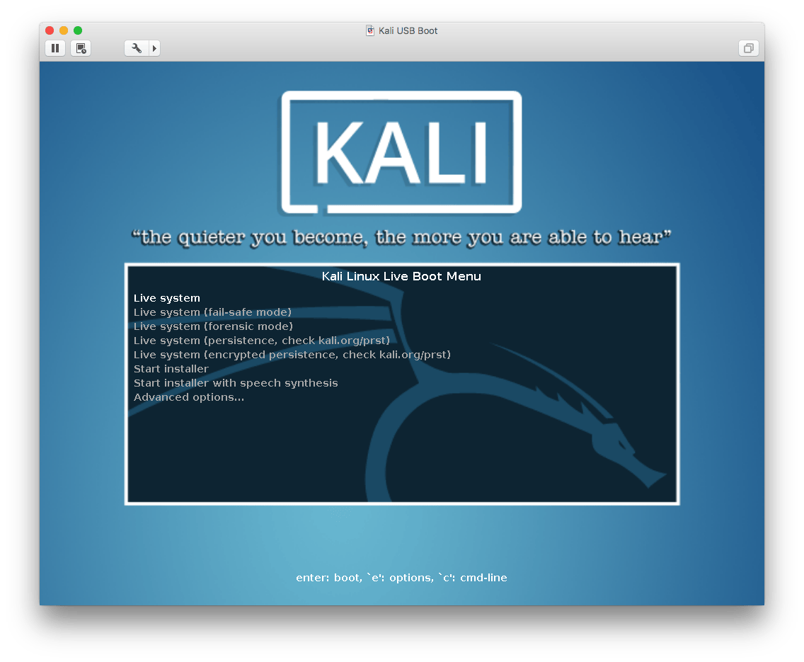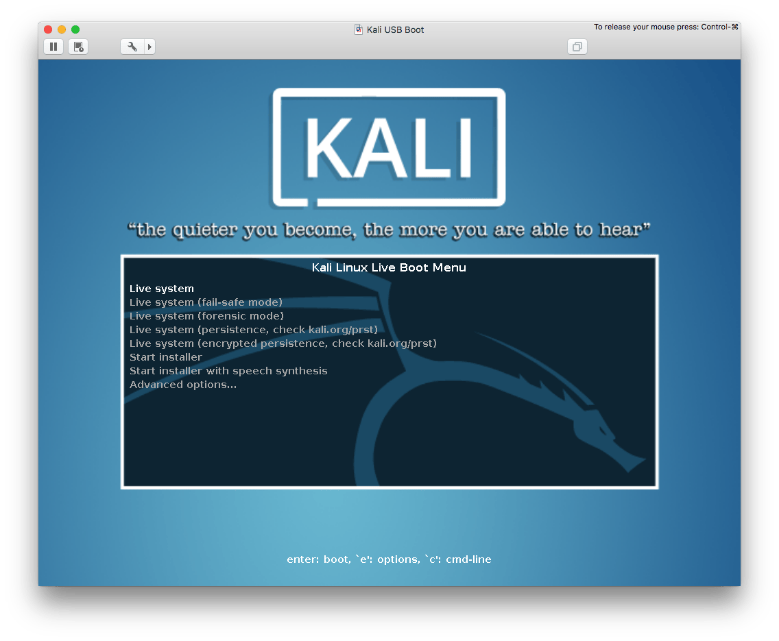 If you don’t get a check mark, this means that your Mac has grabbed the USB drive. Power off your VM, eject the drive from the Mac, and power on the VM again with the USB settings screen up. You should see the check mark and get the Kali boot screen.