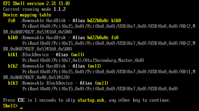 If everything goes well, you’re booted into Kali. Otherwise, you can get to an EFI shell with ESC, “EFI Internal Shell”. A “happy” EFI shell looks like this: