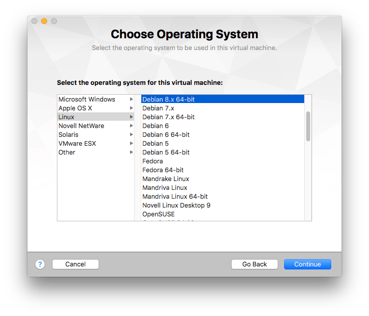 Select “Linux” -> “Debian 8.x 64-bit”.