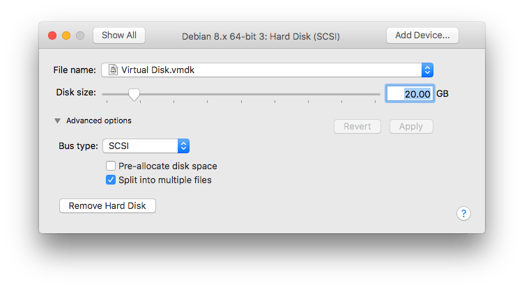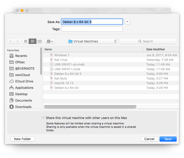 Next, you’ll need to enable EFi booting. There is no GUI setting for this so, you need to find this VM on your hard drive. Virtual hard drives are stored by default in ~/Documents//Virtual Machines.localized. Change to the directory containing this VM. Ours is called “Kali USB Boot” so the full path is ~/Documents//Virtual Machines.localized/Kali USB Boot.vmwarevm". Within that directory is a .vmx file named after the VM. Ours is called Kali USB Boot.vmx. Edit that file with your favourite editor and insert the following line: