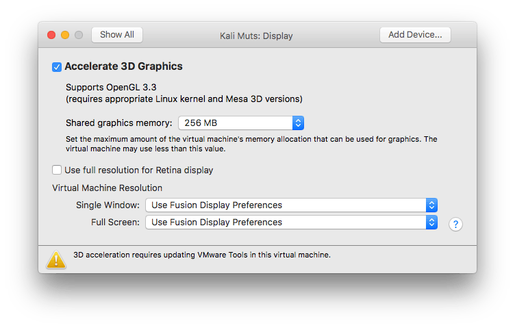 Next, head to “Settings” -> “Display”, and check “Accelerate 3D Graphics”. This is optional, but it really helps the performance of your Kali experience. “Use full resolution..” is also optional.